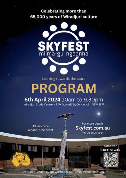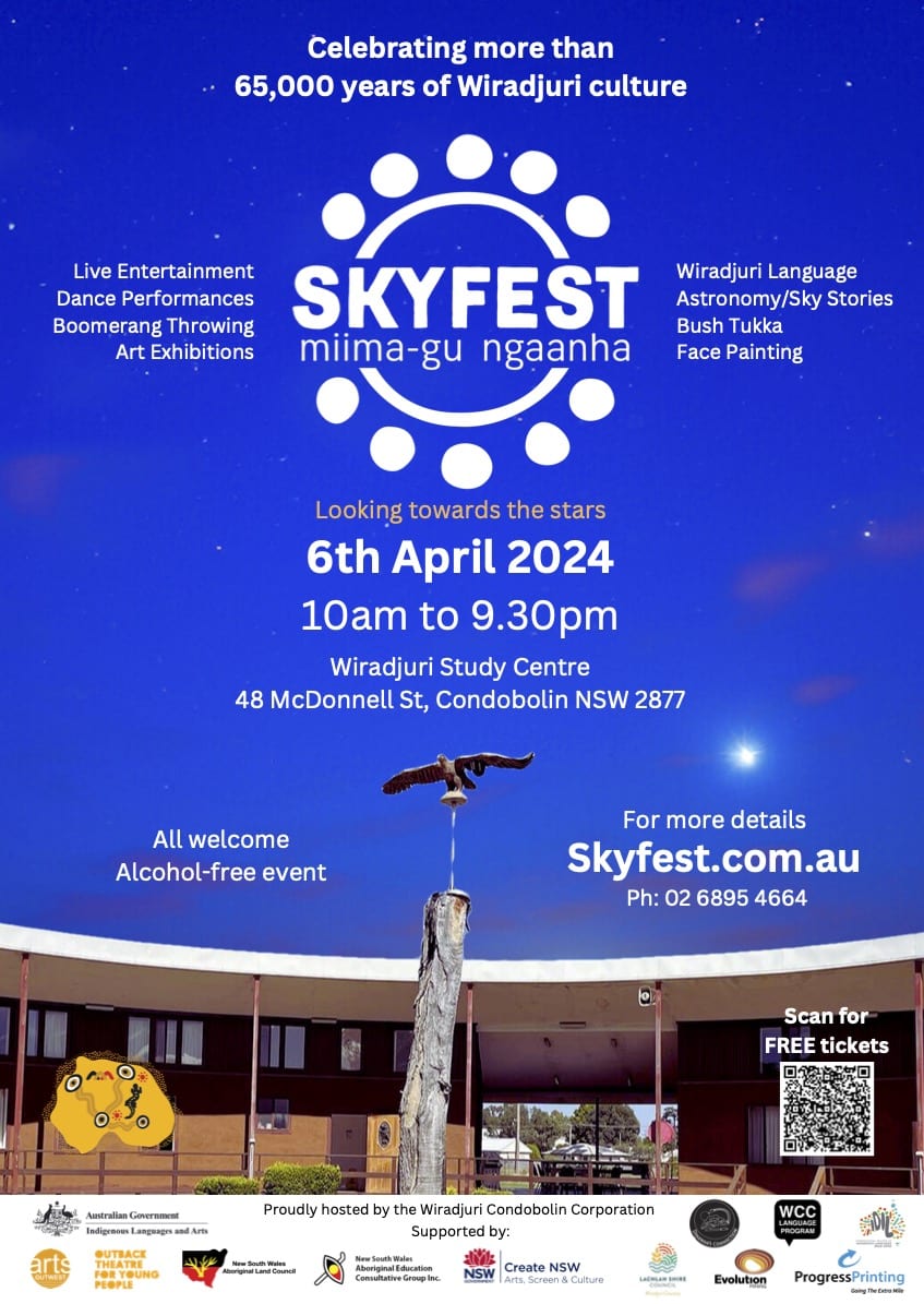 Condo SkyFest Miima-gu Ngaanha (Looking towards the stars) is an annual celebration deeply rooted in over 65,000 years of Wiradjuri culture, community and country. Hosted by the Wiradjuri Condobolin Corporation, this event takes place at the renowned Wiradjuri Study Centre nestled in the heart of Condobolin, a small inland town along the Galari-Lachlan River in central-western New South Wales, Wiradjuri country.